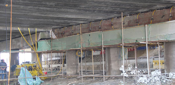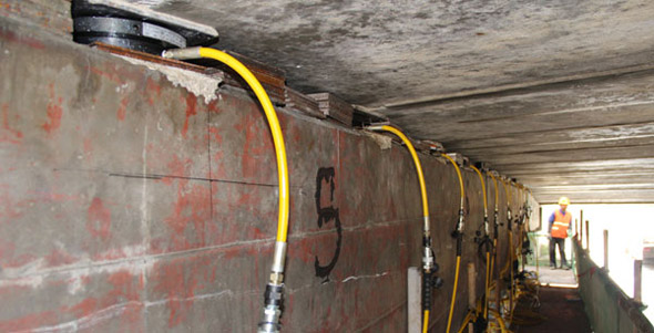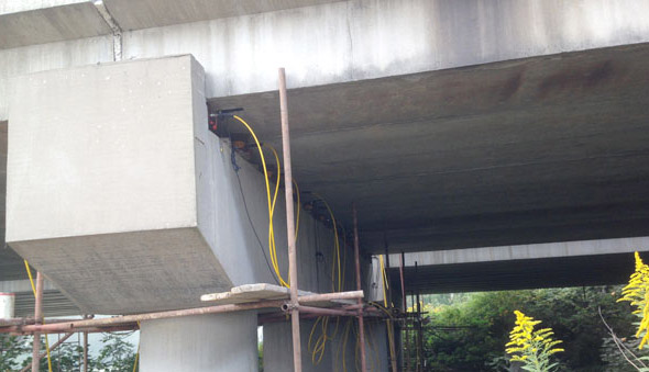 江廣高速公路改造工程JG-GG-2標(biāo)許莊周梓中溝中橋,采用同步千斤頂104臺將原有橋梁抬高50mm及舊支座進(jìn)行更換,此項(xiàng)目為泰州市重點(diǎn)城建項(xiàng)目、國家高速主干道京滬高速江都至廣陵段(簡稱江廣高速)改擴(kuò)建工程, 此次工程將對該橋進(jìn)行拼寬拓孔,即在原有位置往東側(cè)增加4孔,加長86米。