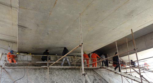 首先我司工作人員對(duì)鎮(zhèn)江路段橋梁的跨距、每跨的梁片數(shù)、梁片的結(jié)構(gòu)形式以及橋梁的高度進(jìn)行現(xiàn)場(chǎng)現(xiàn)場(chǎng)勘察。并查看相關(guān)圖紙核實(shí)橋梁縱向連續(xù)梁片數(shù),從而初步計(jì)算出梁體重量及荷載能力。然后經(jīng)過測(cè)量梁片與墩臺(tái)之間的實(shí)際距離,研究放置千斤頂?shù)奈恢眉芭R時(shí)支撐位置。討論現(xiàn)場(chǎng)施工操作人員、觀察人員的位置以及整個(gè)施工環(huán)境。
