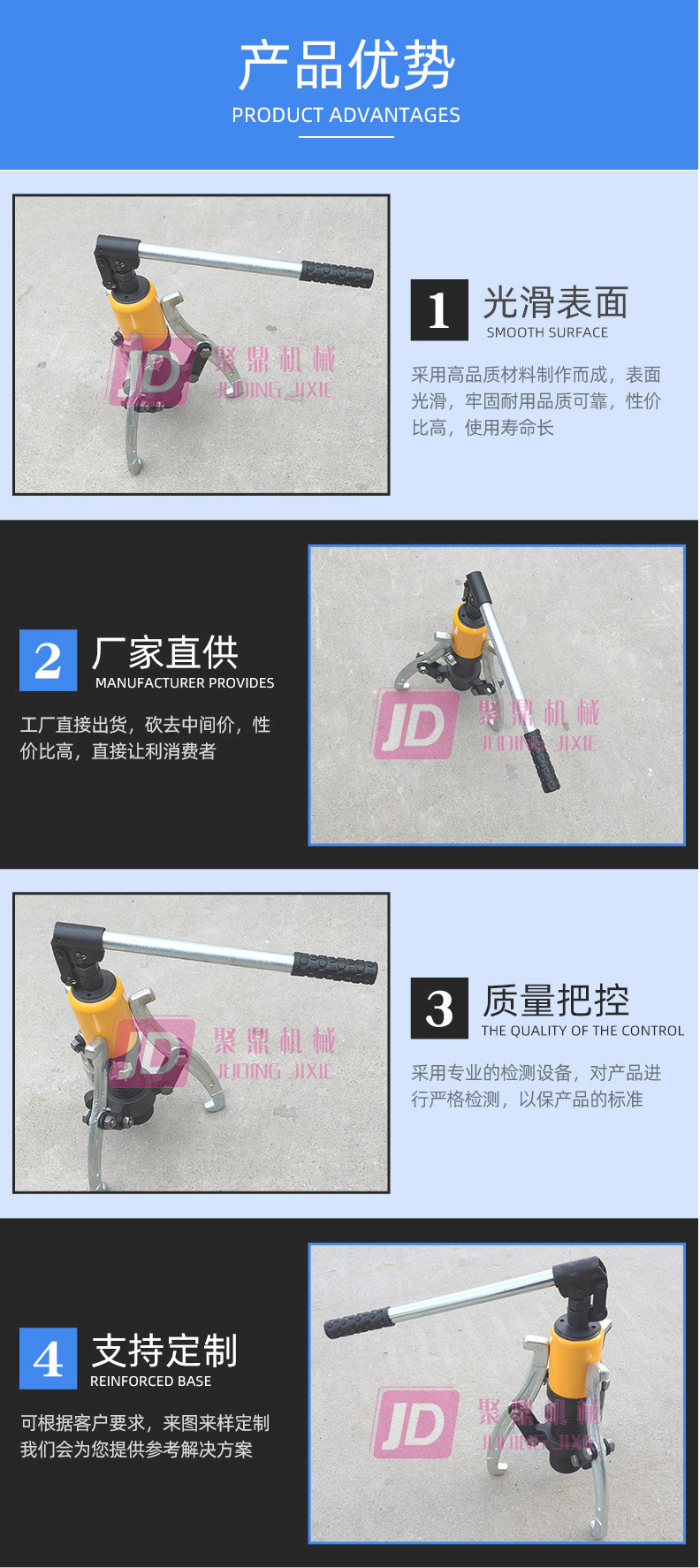 液壓拉馬是以液壓起動(dòng)桿直接前進(jìn)移動(dòng),故推動(dòng)桿本身不作轉(zhuǎn)動(dòng)。鉤爪座又可隨螺紋直接作前進(jìn)后退之調(diào)距,操作時(shí)只要把手前后小幅度擺動(dòng),油壓起動(dòng)桿前移,鉤爪相對(duì)應(yīng)后退,把被拉物體拉出。